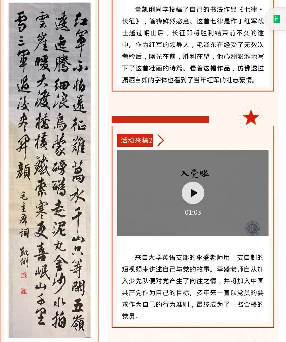 “激昂发声,唱响党史学习主旋律”。公司党委坚持紧扣“为什么学习党史”“学什么党史”“怎样学习党史”三大问题,还充分利用新媒体,打造极具专业特色的虚实结合党史学习平台,面向全院师生开展红色征集令——我与党的故事,使党史文化理论更具有吸引力,促进党史文化真正实现“入脑、入心”,坚持做好公司师生党史学习教育的“传声筒”;依托“东华外院新闻站”公共号开辟党史学习微专栏,易班平台开展“党史故事我来讲”等丰富多彩的活动平台,坚持党史学习教育的引领地位,以此发挥出党史学习教育的强大育人功能;通过利用互联网创设教学情境,打造“互动式+体验式”党史学习新课堂,将党史融入公司全员、全程、全课程育人的大格局,打通党史教育“最后一公里”,将党史的滋养转化为全院师生的政治本色,奋斗的行动动力。