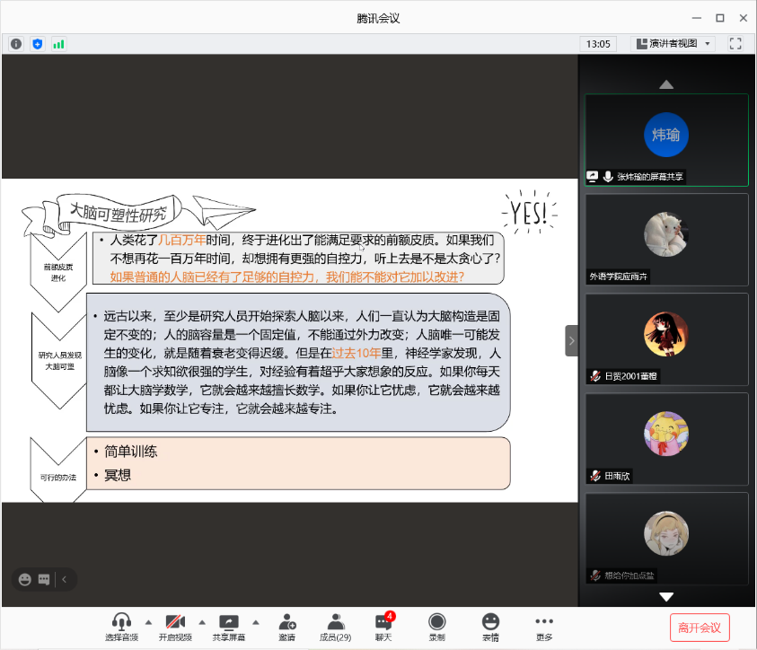 接下来,张玮瑜同学结合PPT分享了《自控力》一书的主要章节内容,为大家详细介绍了“自控力由什么决定”、“‘那又如何’效应”等奇妙的心理学知识。除此之外,张同学还认为,锻炼意志力、冥想等方法可以有效提升我们的自控力,提升我们的集中注意力、管理压力、克制冲动和认识自我的能力。