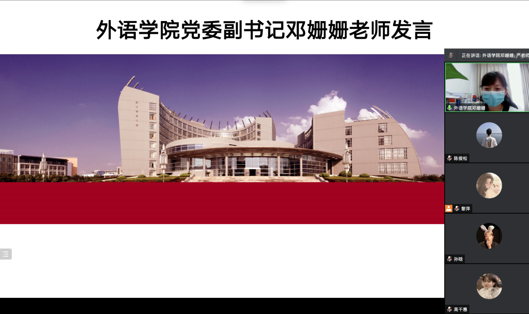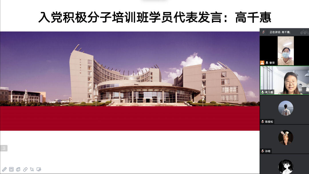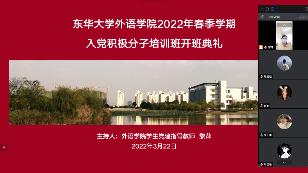 会上,邓姗姗对入党积极分子们的发展和成长寄予深切希望,她从“为什么学、学什么、怎么学”三个方面出发,要求学员们严格遵守党校规章制度,做到思想重视、勤于思考、学以致用,认真学习党课内容及相关学习材料,树立优良学风。她强调,要珍惜此次党校培训的学习机会,端正学习态度,深刻理解党员标准,实现自我提升、自我突破、自我超越。黎萍也介绍了党校的课程安排、纪律要求及重要意义,宣读了本次入党积极分子党校培训班的培训方案和考核标准,在本次“云党校”的教学中,学员们更要注重学习的实效性,提高自己的觉悟与认知,自觉遵守党校的各项规章制度和教学安排,学有所得、学有收获。